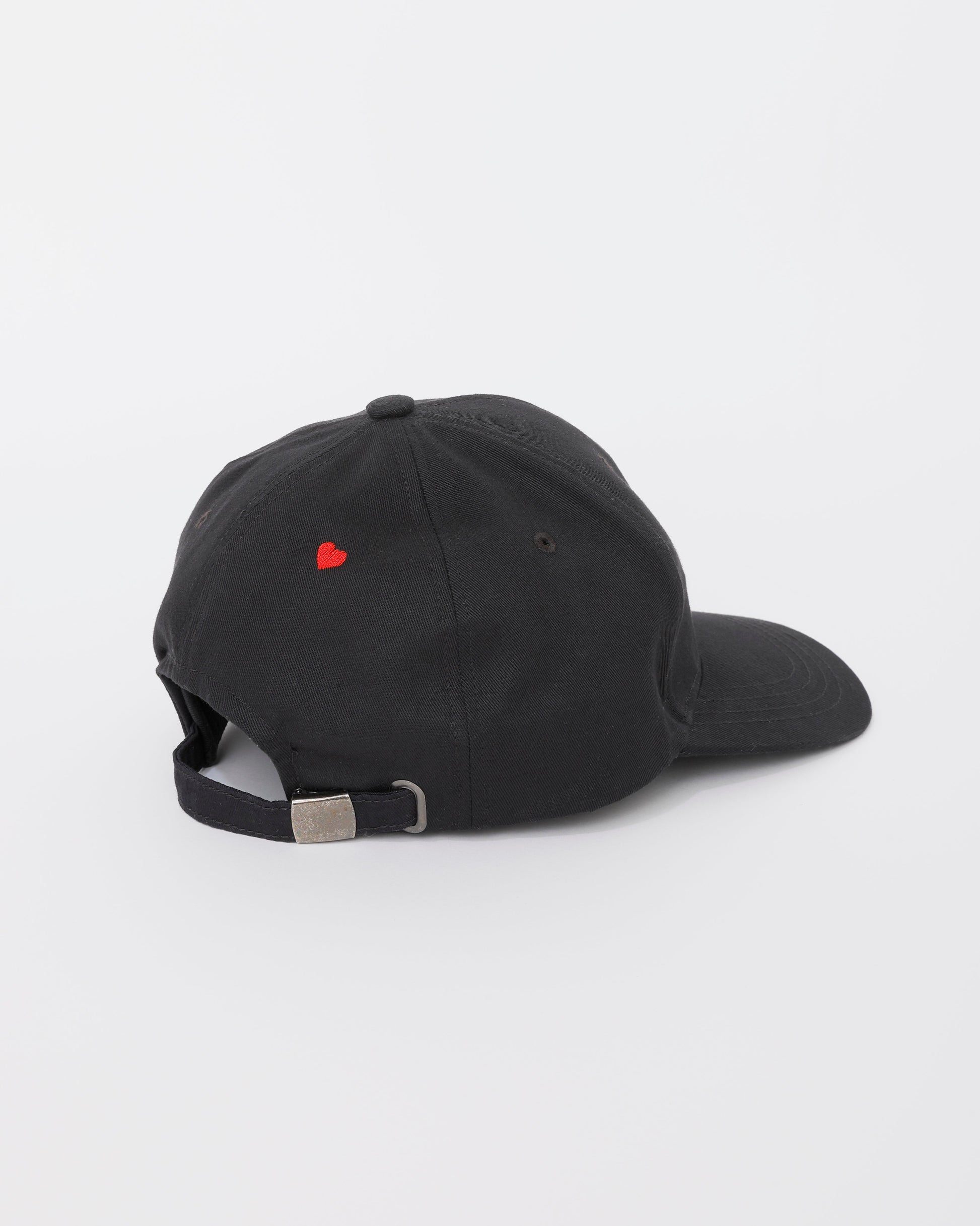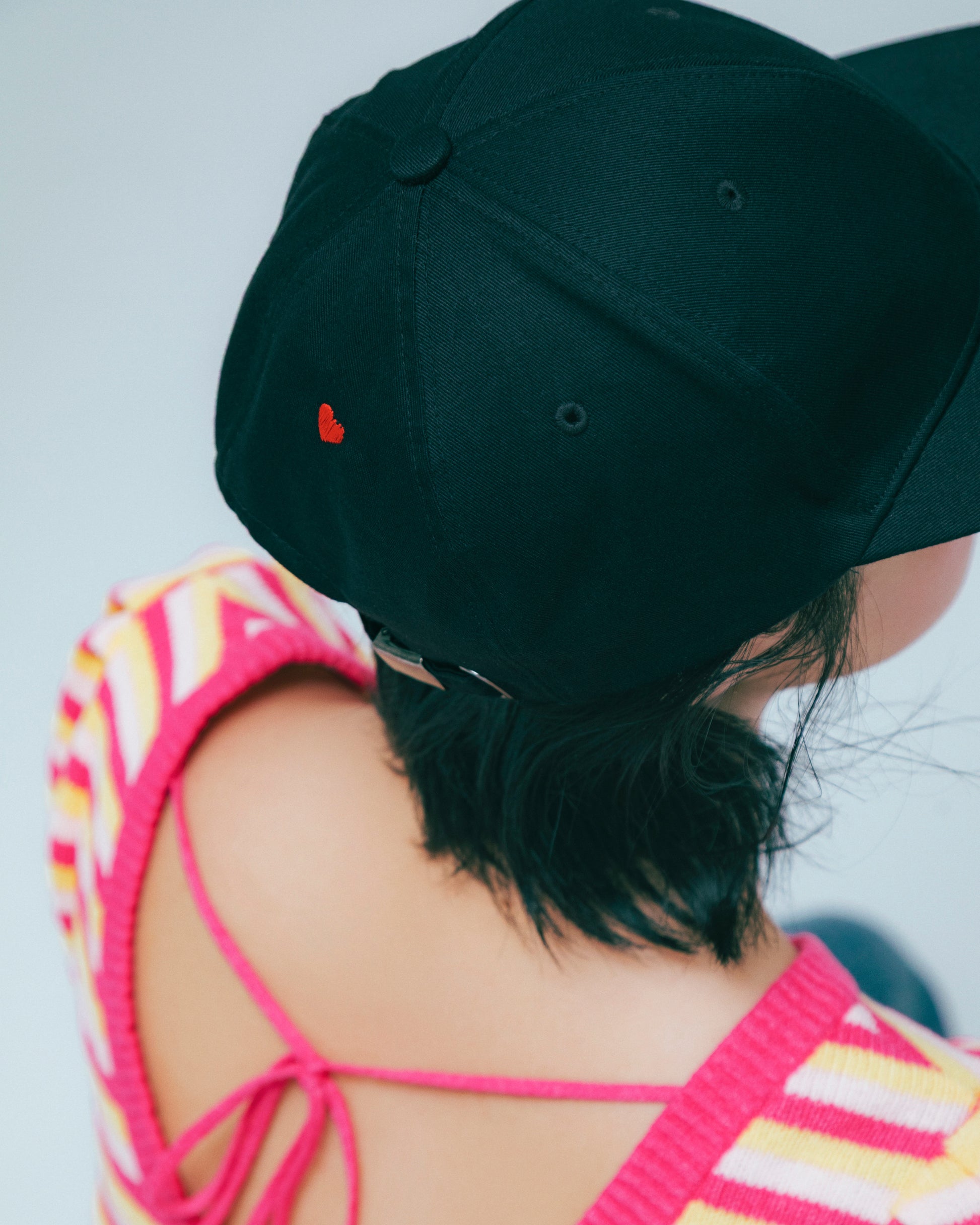 バックのハートとスターのさりげない刺繍がポイント。長めのつばに深めのシルエットでフィット感と小顔効果も期待できます。