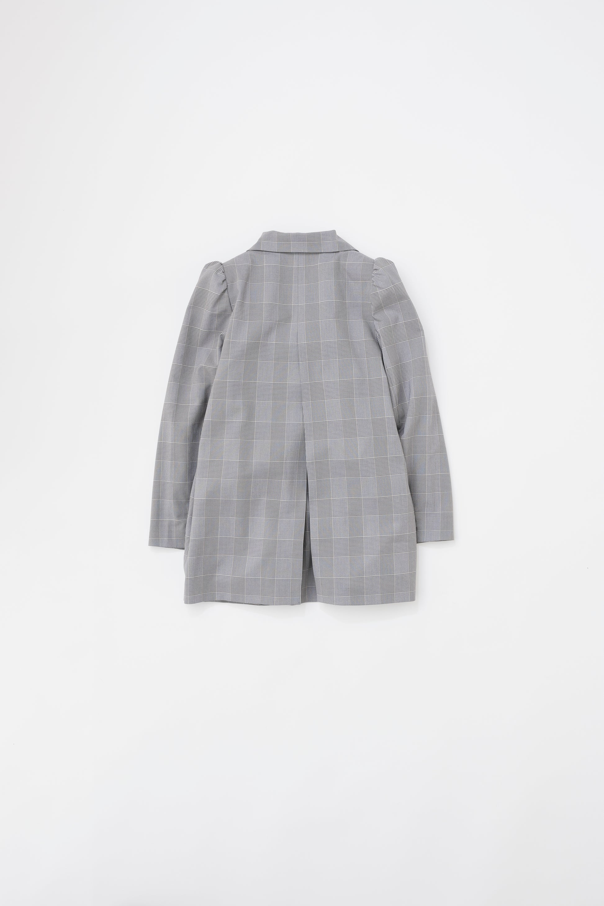 クラシックなジャケットスタイルに、遊び心のあるディテールを加えた一着。シンプルなフロントに対し、後ろは大胆に開いたスリット仕様で、動きのあるシルエットと抜け感を演出します。